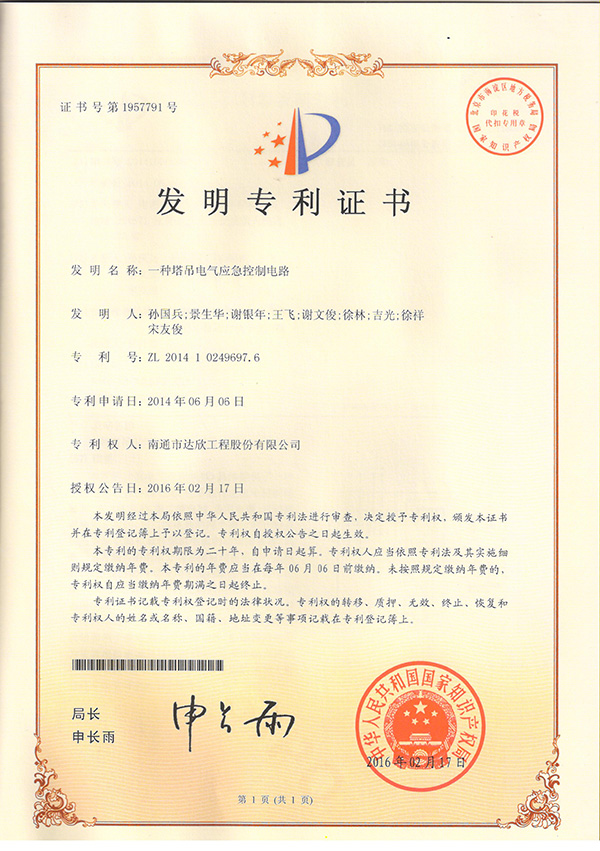 【另 訊】:由第五工程公司2014年6月申報(bào)的《一種塔吊電氣應(yīng)急控制電路》,于2016年2月17日獲得國家知識(shí)產(chǎn)權(quán)局授權(quán)的發(fā)明專利證書。