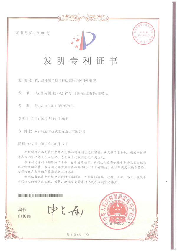 由第一工程公司申報(bào)的《懸掛腳手架拉桿快速裝拆連接頭裝置》成功獲國家知識(shí)產(chǎn)權(quán)局授權(quán),于2016年8月17日獲得國家發(fā)明專利證書。該發(fā)明專利系工程公司《無攬風(fēng)繩獨(dú)立桅桿吊裝勁性鋼柱專用夾具》后又一國家發(fā)明專利。