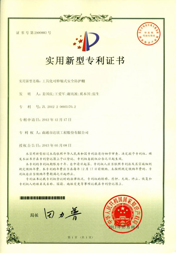 成果二提出了一種建筑施工現(xiàn)場用工具化可伸縮式的安全防護(hù)棚,將防護(hù)棚由通常的整體式結(jié)構(gòu)改成單元式、定型化、工具式結(jié)構(gòu),可根據(jù)場地需要組合成多種尺寸,且所有構(gòu)件單元可重復(fù)周轉(zhuǎn)使用,整體安裝方便快捷,從而提高各類安全防護(hù)棚的安裝速度和安全性,能較好的滿足施工現(xiàn)場的標(biāo)準(zhǔn)化、規(guī)范化、安全文明施工的要求,推進(jìn)了科技進(jìn)步。