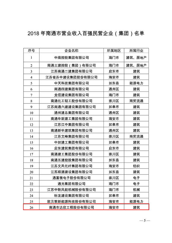 4月23日,南通市工業(yè)和信息化局發(fā)布關于2018年南通市營業(yè)收入百強民營企業(yè)(集團)情況的通報。南通市達欣工程股份有限公司以出色的業(yè)績榮登百強企業(yè)榜單,列26位,排名海安第5位(海安共有26家入圍)。