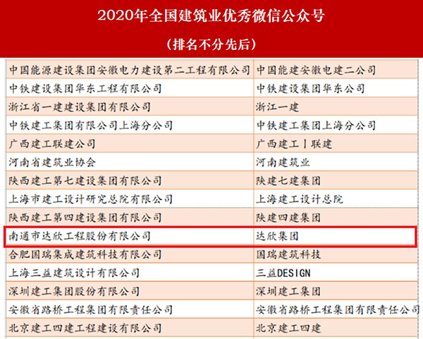近日,由建筑時報社主辦的2020年建筑業(yè)微信公眾號運維經(jīng)驗交流研討會暨2020年全國建筑業(yè)優(yōu)秀微信公眾號頒獎典禮在揚州召開。會上,公布了2020年全國建筑業(yè)“最具影響力”微信公眾號和2020年全國建筑業(yè)優(yōu)秀微信公眾號榜單。達(dá)欣集團獲得2020年全國建筑業(yè)優(yōu)秀微信公眾號。