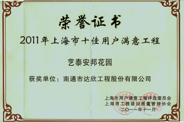 上海市“十佳用戶滿意工程”是上海市建筑業(yè)重量級(jí)獎(jiǎng)項(xiàng),是上海市在建的大型工程中,通過業(yè)主等部門使用后,選出十五項(xiàng)質(zhì)量?jī)?yōu)秀、后期運(yùn)行穩(wěn)定、服務(wù)質(zhì)量?jī)?yōu)秀的工程為候選單位,并在十五項(xiàng)候選工程中選出十項(xiàng)通過專家評(píng)審,方可獲得上海市“十佳用戶滿意工程”獎(jiǎng)。獲此獎(jiǎng)項(xiàng)標(biāo)志著達(dá)欣公司進(jìn)滬施工的信譽(yù)和業(yè)績(jī)提高到了一個(gè)更高層次,必將對(duì)持續(xù)經(jīng)營開發(fā)起到良好的社會(huì)影響。