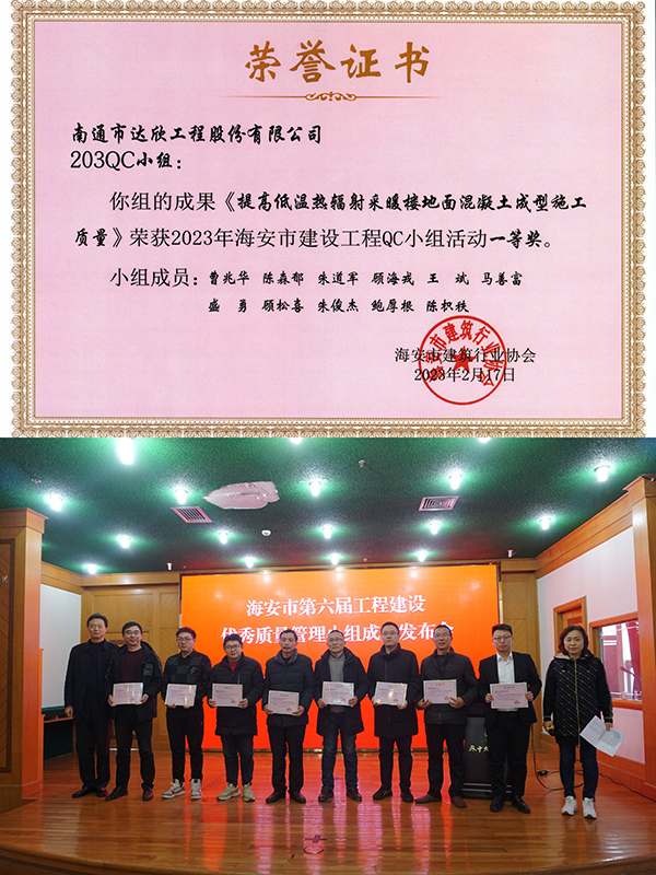 2月17日,海安市建筑業(yè)協(xié)會舉辦了海安市第六屆工程建設優(yōu)秀質量管理小組成果發(fā)布會,集團選送的成果《提高低溫熱輻射采暖樓地面混凝土成型施工質量》榮獲一等獎。集團技術質量部、BIM中心經(jīng)理王賽作為評委參與成果點評,集團技術質量部、第二工程公司和第九工程公司相關技術人員參加活動。